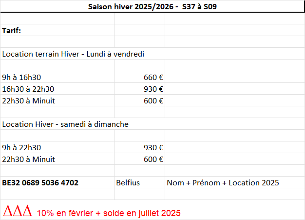 1. Via les abonnements que nous proposons. Comment ça marche ? Vous choissisez dans le semainier (voir ci-dessous) un créneaux toujours libre (en blanc) qui vous intéresse. Vous nous contacter par email (beaufays.tc@gmail.com) afin que nous vous bloquions votre terrain au créneau horaire voulu et vous pourrez profiter de votre terrain du lundi 8 septembre au dimanche 1er mars 2026.